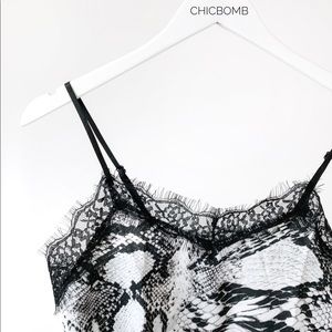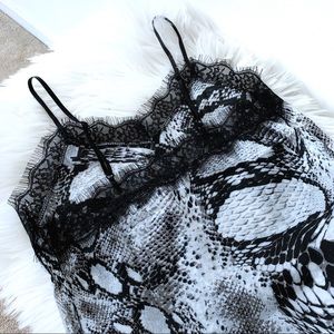 NEW with adjustable spaghetti straps. Eyelash lace with soft snakeskin printed fabric.