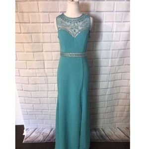 Stunning NWT B Darlin teal prom dress. High sheer neckline adorned with stones and sequins. Criss cross back. Back zipper. Sleeveless. Beaded waist.