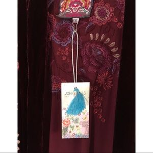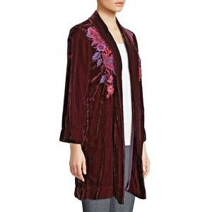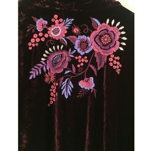 The Marcella velvet jacket is a stunning robe in a deep burgundy velvet from Johnny Was. Functional front pockets and a loose comfortable fit, you won't want to take this off! Floral Embroidery.