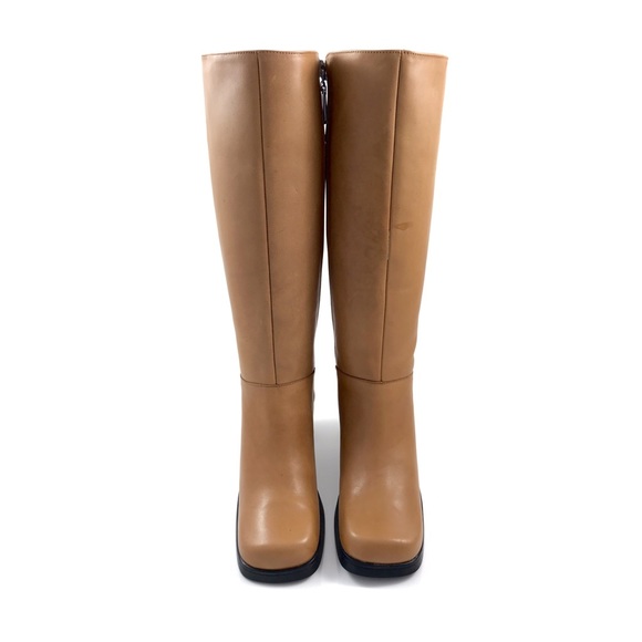 90’s TOMMY HILFIGER camel leather knee high chunky boots. Square toe with platform and chunky heels. Full inner zipper with Tommy Hilfiger logo. Platforms have the Tommy Hilfiger logo embedded above the heels. Hidden elastic at the top of boots. Made in Brazil. Large star ⭐️ on the rubber soles. Excellent vintage condition! Marked size 10 M (medium width). Heels measure 3.5”, platform measures 0.5”, ball width is 4” wide, boot height is 15.5” tall.