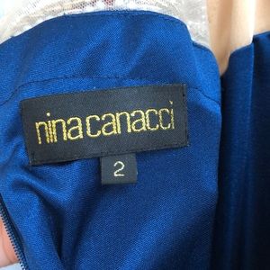 Stretchy blue material bottom with mesh sequined top, backless, size 2, near perfect condition. A couple jewels loose in the back