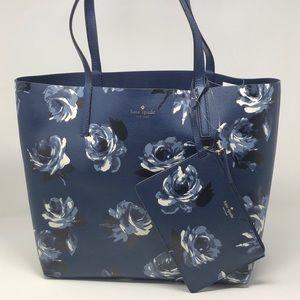 Kate spade Mya arch place navy multi (428). Measurements about 12.4"h x 13”lenght 6”width 9”Drop Double face pebbled leather unlined . Open top tote reversible comes with pouch floating kate spade new york signature .