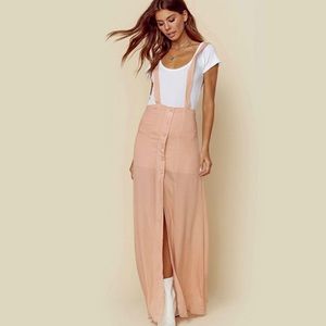 Peach & white polka dot maxi skirt, buttons up front with adjustable suspenders.