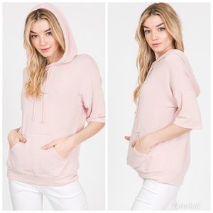 A French terry sweatshirt/hoodie, featuring 3/4 sleeves, dropped shoulder, and a front pocket.