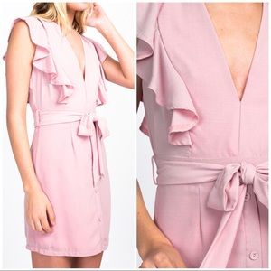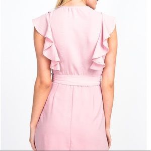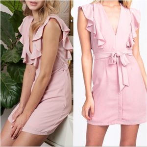 Adorable pink tie waist dress with the sweetest ruffle detail along the shoulder edge. Button down front with a v-neckline. Slight A-line fit. Fully lined. Model is wearing a size small. WH0032.