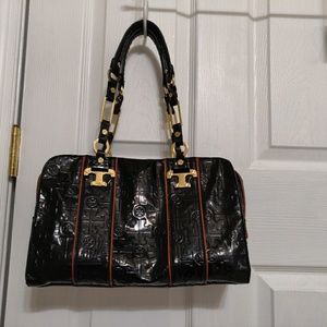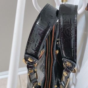 Black embossed patent leather Tory Burch Nico Lux T Bag with cognac leather trim, gold-tone hardware, interior zip pocket, dual wall pockets and top zip closure.