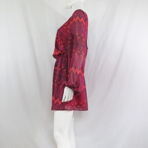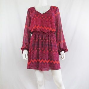 Super cute long sleeve mini dress in rajah print by Show Me Your Mumu! Details include rounded v-neck, keyhole back, puffy poet sleeves, gathered stretchy waist, bottom half with a flap for a faux wrap look, and lined top front and bottom.