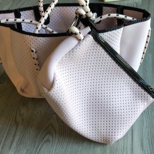 perforated neoprene mini tote bag. Also will be available in various colors and 2 sizes. This bag can be used as a crossbody bag or tote and comes with a detachable pochette perfect for essentials.