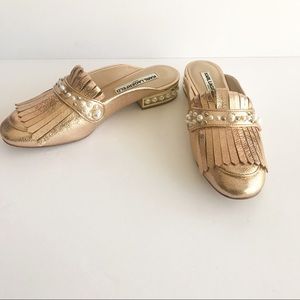 Karl Lagerfeld Becky Faux Pearl Embellished Slides/Mules in a beautiful metallic rose gold leather.