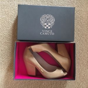 For sale is a pair of Vince Camuto Berit open toe blush patent leather chunky block heels. They are size 8 and are in great condition! The shoes were worn only one time. There is a small scuff on the back of the bottom of one of the heels as indicated by the pictures. The shoes come with the original box!