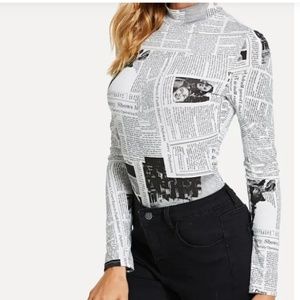 Black and white news paper print long sleeve light wait super stretch Tee. 95% polyester and 5% spandex. Size L. fits sizes 8/10 and 12/14 (very stretchy)