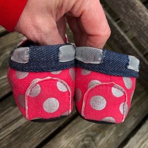 Vegan pink suede with metallic polka-dots trimmed in blue denim and chiffon bow!! Durable rubber bottom soles.