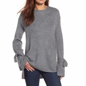 Halogen Gray Tie Bell Sleeve High Low Sweater in Size Extra Small! Ties cinching the lower sleeves make this cozy, oversized pullover right on point with this season's most feminine trend.