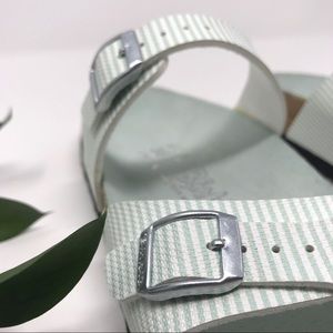 These gorgeous sandals from Birki's by Birkenstock are perfect for spring and summer with their seersucker-like narrow light blue and white stripes. Two buckle straps. In NWOB condition!