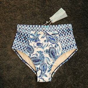 Blue, black and white pattern- high waisted swim bottoms. New with tag! Super cute pattern and great, well made fit. Just in time for spring/summer! I have 3 available, all are size S/P (small/petite)