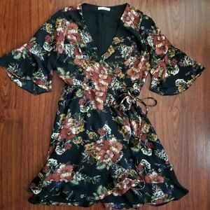 June & Hudson floral dress. Blackneirh orange rust color flowers. Wrap tie dress. Flowy sleeve. Tbe size was removed. So please check pictures with measurements. I say it's a Medium.
