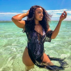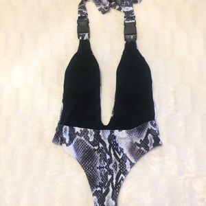 Plunging neckline one piece. High cut leg openings. Brazilian cut (cheeky) rear. Long straps for versatile styling. Side release buckle for an utilitarian look.