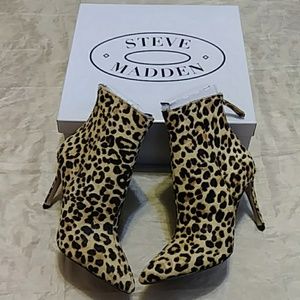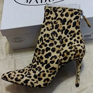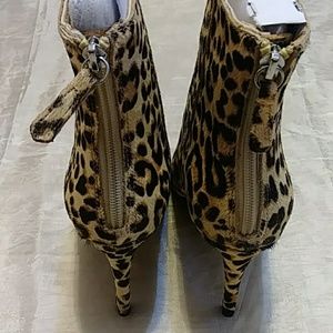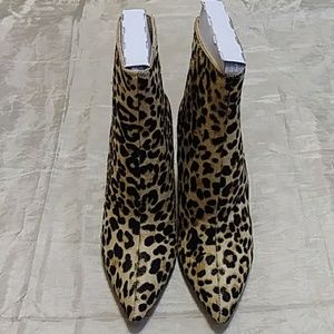 NWT. Leopard Calf Hair Texture. Pointed Toe. Stiletto Heel. Back Zipper. Man Made Lining/Sole. 4.5 inch shaft height. About a 4 inch heel. Size 7.5.