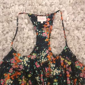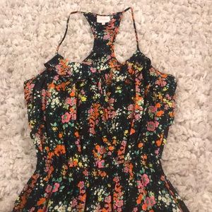 Small Parker silk dress. Black with orange, pink and yellow flower print. Ruffle along the neckline. Racer back
