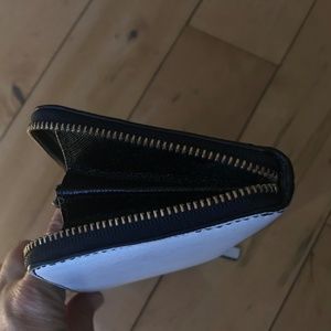 Stunning, never used, black and white shiny leather wallet and card holder. 8 in long x3.5x tall x 1/2 inch deep (when zipped).