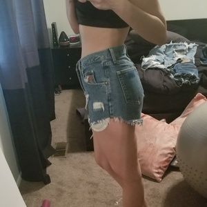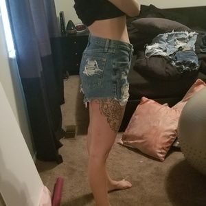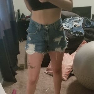 High waist / Mom jeans/ vintage fit. Whatever you want to call it! Heavily distressed with pockets peeking out. Medium wash Slightly longer in the back.