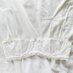 New, without tags. Size 32a. White with pastel yellow accents. Underwire cups, adjustable straps, hook closure, cotton eyelet design, scalloped trim, lined. Such a cute bra for spring and summer!