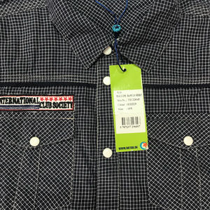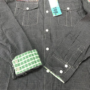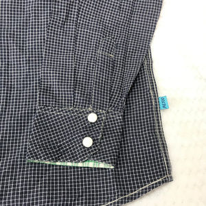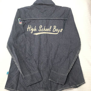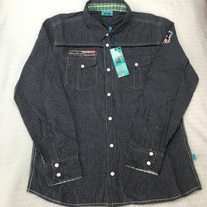 New Amazing rocker style dress shirt with awesome patches and graphics. Soft and lightweight in bright blue—your kid will stand out as the coolest in the room. By Me Too in size 10 ( Husky). Boy's Dress Shirt. Plaid. Long Sleeve with contrast cuffs.