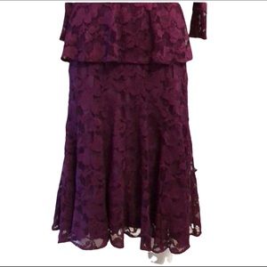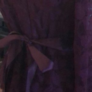 Plum color, lace overlay, 3/4” sleeves, hits below the knee (I'm 5’6”), hidden zipper back, built in plum color slip, satin ribbon for tying in front or back. Great for a nice night out and definitely considered a cocktail dress! Looks like the back bottom of the dress was drug on the floor or rolled on. I will add more pictures shortly (written on 05/16/25)..