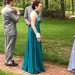 Gorgeous teal two piece Sherri Hill! Has been hemmed to suit 5’4” with added length to wear heels. Padded bra cups for extra support.
