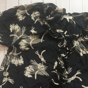 Lovely Joie silk blouse with ruffles and fabric-covered buttons down the front. The sleeves The sleeve hem and bottom hem have been topstitched with lightly elasticized thread. Excellent pre-owned condition.