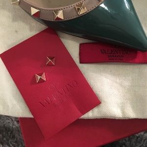 Well loved 100% authentic Valentino pumps in a fun, forest green with classic gold studs. The only true sign of wear is in the bottoms of the shoes, as pictured. I'm happy to get them resoled at my favorite shoe repair place, but figured I could save someone some $ by not doing it myself. These are GORGEOUS, pictures seriously don't do them any justice. Happy to answer any questions, and always open to offers!