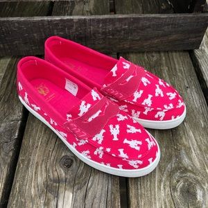 Summer fun! Pink canvas with white lobster print. Hot pink leather strip across footbed. Rubber soles.