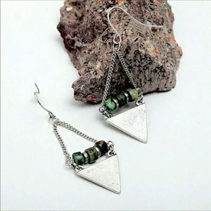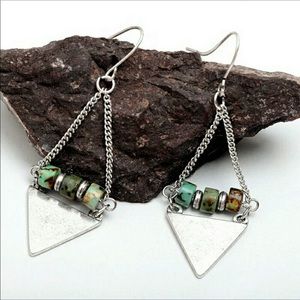Natural stone beads rest atop a sterling silver plated triangle in these Coachella Festival Collection earrings. The triangle is hammered for an edgy effect. Artisan made in the USA! πΊπΈπΊπΈπΊπΈ
