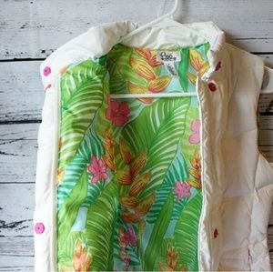 Description: White down, flattering lines. Pink buttons and classic tropical print inside. Front pockets. Good condition!