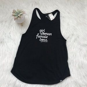 NWT adidas girl female woman boss cursive script tank top. Black with white lettering. Loose fit. Size small.