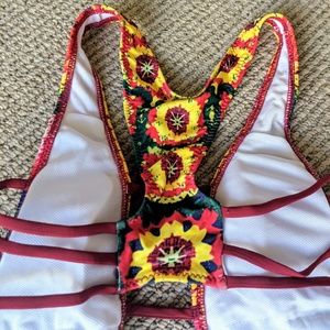This is very sexy on. Multi-color one piece bikini. Back is open and key hold in middle of chest. Bottoms are cheeky. Really cute design. Red straps around upper side torso, across middle of chest, and on side of hips. Never worn, I have tried it on but it has never been out of my drawer since.