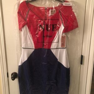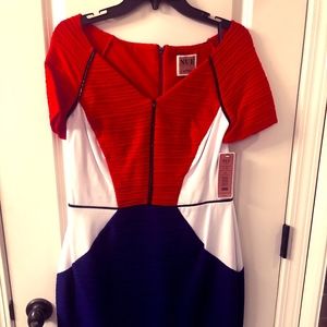 New by Shani dress brand new. Never been worn, still in plastic with tags on. Red, white and blue with black vinyl piping. Short sleeve, bodycon dress. Interior structure is body shaping. Very well made dress, good quality. Size 12