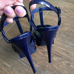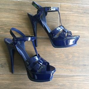 YSL Saint Laurent Navy Blue Patent 105 Tribute platform sandals in size 6.5. In EXCELLENT condition! Worn only twice. Navy blue patent leather in perfect condition. Very comfortable.