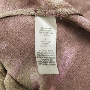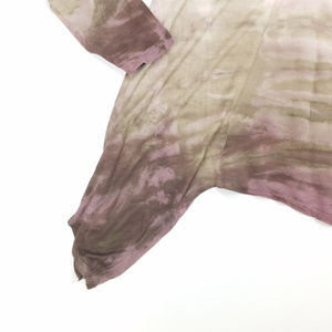 Called the Ashbury Tunic. Oversized. Blush pink, brown, purple, grey colors. Ombre. Longer on the sides. Assymetrical hem. Tunic length, long through the body. Full length, long sleeves. Small spot on the back, blend with the ombré colors. Style 38569. 100% rayon.