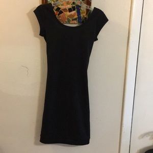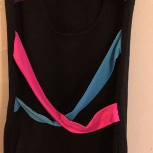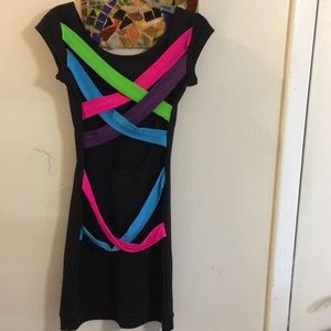 Really Adorable: Tres Bien Little Black Bodycon Short Sleeve Dress w/Blue/Lime/Purple/Hot Pink Band across Low Cut Back. Size Small. Bust 34”. Very Good Condition.
