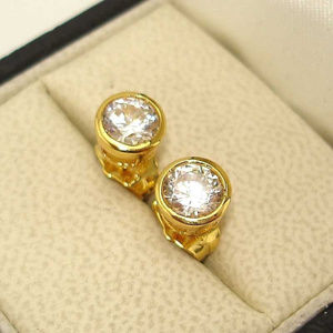 Beautiful classic sparkling jewelry bezel design zircon stud earrings 24K yellow gold filled w/round simulated diamond topaz zircon gemstones. Fine quality, polished shine, brand new, never been worn. Lead and nickel free.