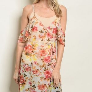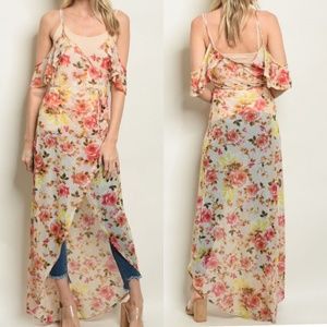 ♡ Floral Cold Shoulders wrap style Maxi Duster Dress! Beautiful semi sheer floral dress / swim cover up! Would look great layered over a slip/dress or as a cover-up for the pool / beach! So fabulous! Wrap style waist is adjustable and flattering!