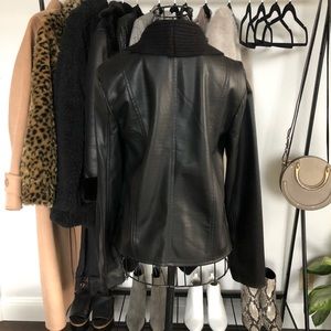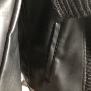 This vegan leather jacket is perfect for all year round! It features a soft faux suede lining, gorgeous knit draped front, and pockets. Worn once. Pairs perfectly with jeans and heels for a casual polished look or sneakers for the chic girl on the go. No signs of pilling or wear except one small area near the back of the neck with a small loop. Priced to reflect. No trades.