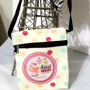 🍡New super cute Multi useful vinyl zipper bag...adorabel Adorned with Sweet Bakery decor cupcakes 1990 bakery inspired theme..Great size for traveling, camera' cell phone etc...Multi Use shopping, or simply a cute gift! Cream color with polka dots to compliment the cupcakes🍩