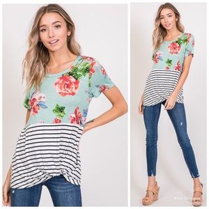STRIPED FLORAL FRONT KNOT TOP