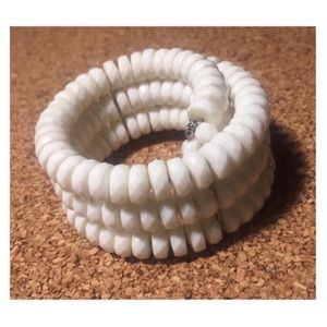 Pretty three row wrap statement bracelet is in perfect shape. Springs back to original shape on any size wrist. Faceted beads subtlety capture the light. Well made and timeless.
