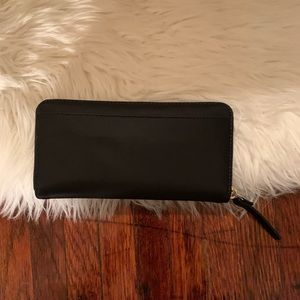 This Kate spade black cross body is in new condition as well as the wallet. The cross body purse has a middle zipper compartment, a side zipper and two pockets on the inside. The wallet holds 12 cards, a money slot, coin slot as well as two pockets on each side. Smoke free. LIKE NEW!