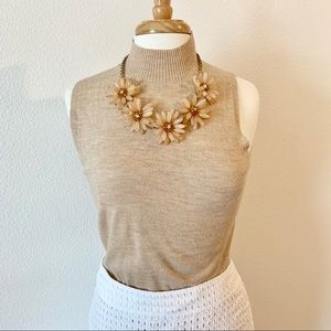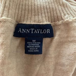 Tan colored turtleneck sleeveless sweater. Light material could easily be worn in all seasons. Excellent wardrobe basic.