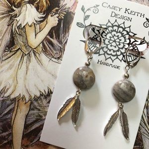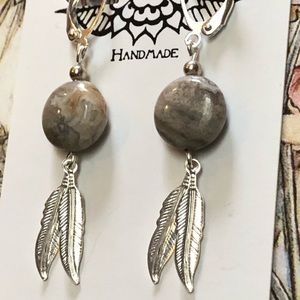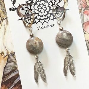 Delicate silver plated brass feathers dangle from hand polished natural laguna Agate coins on silver plated Leverback earwires. Lightweight & secure - wear these to work for a day on the phone and off to the carnival for a ride on the zipper - comfort is guaranteed . Purchase includes Cecile Barker vintage illustration postcard and artist’s signature gift packaging.