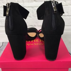 NWB Catherine Malandrino black ankle strap chunky heel. Only tried on. Vegan suede. 3 7/8" high chunky heel.